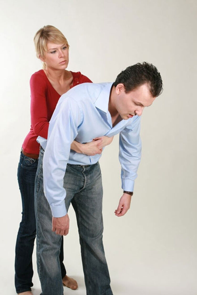 Den nach vorne gebeugten Betroffenen mit beiden Armen von hinten um den Bauch fassen